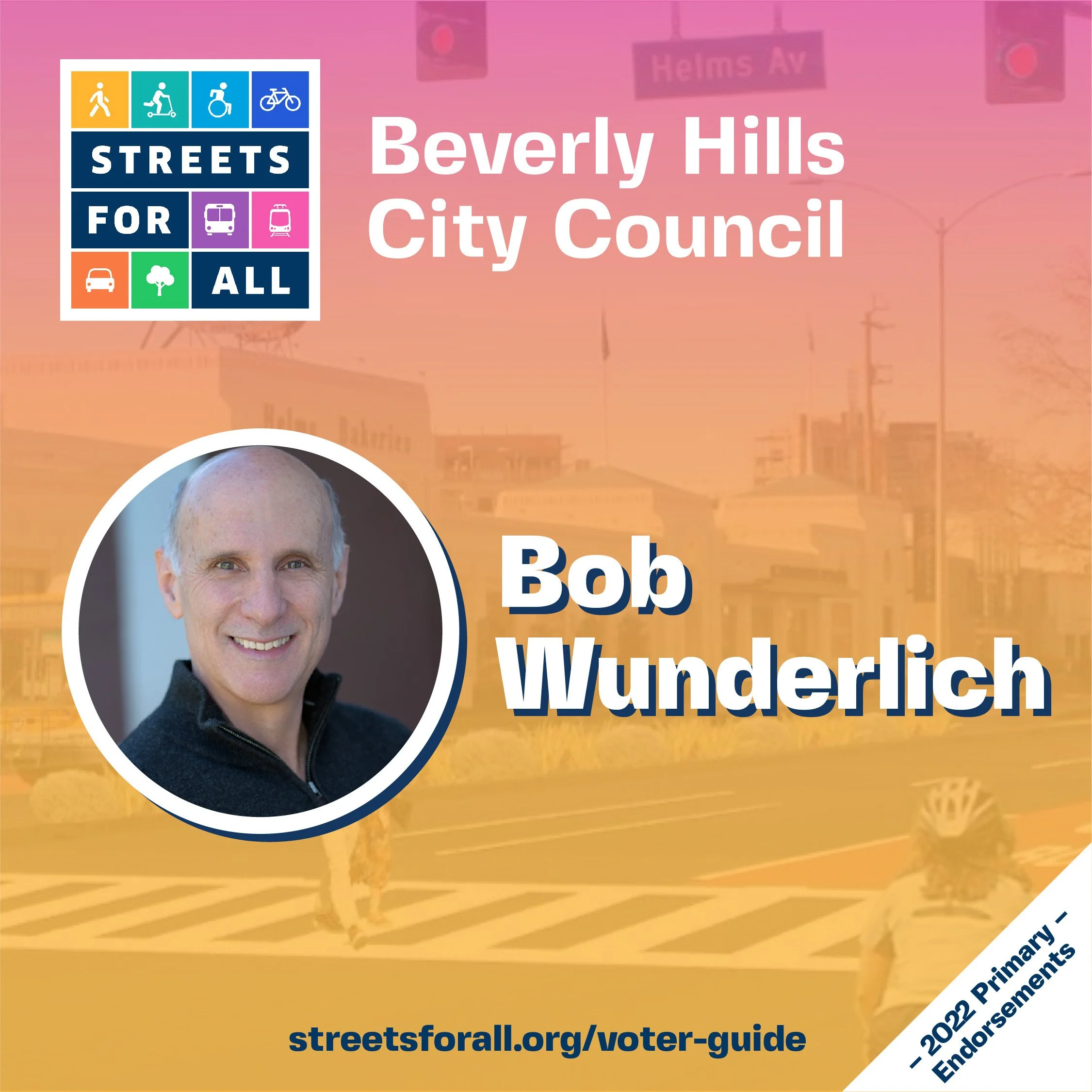 Bob Wunderlich, having just completed a term as Mayor of Beverly Hills, has led by example. Bob regularly bikes around town, including to/from city council meetings! He is a champion of more progressive road design in Beverly Hills, and presided over Beverly Hills’ first protected bike lane.