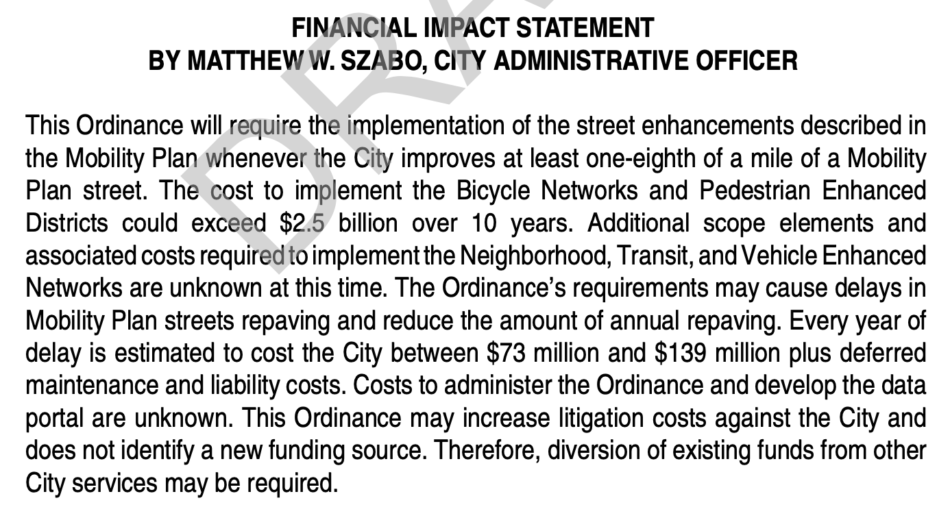 Every year more than 300 people die on our streets and thousands are permanently injured because we haven’t invested in safe infrastructure. We are bearing the burden of decades of underinvestment and poor planning on LA streets. While we believe the CAO estimate is significantly inflated, even $2.5 billion over 10 years for safer streets, cleaner air, and less traffic would be a valuable investment. For comparison, it is less than NYC’s planned spending of $4 billion just on vision zero over the next 10 years (a city with fewer miles of streets) where investments have successfully reduced traffic fatalities. The bottom line is the City Council passed the Mobility Plan 2035 back in 2015 and the City has barely implemented any of it. It should not be sticker shock to keep Angelenos safe when crossing the street, and the cost should not be misrepresented to voters.