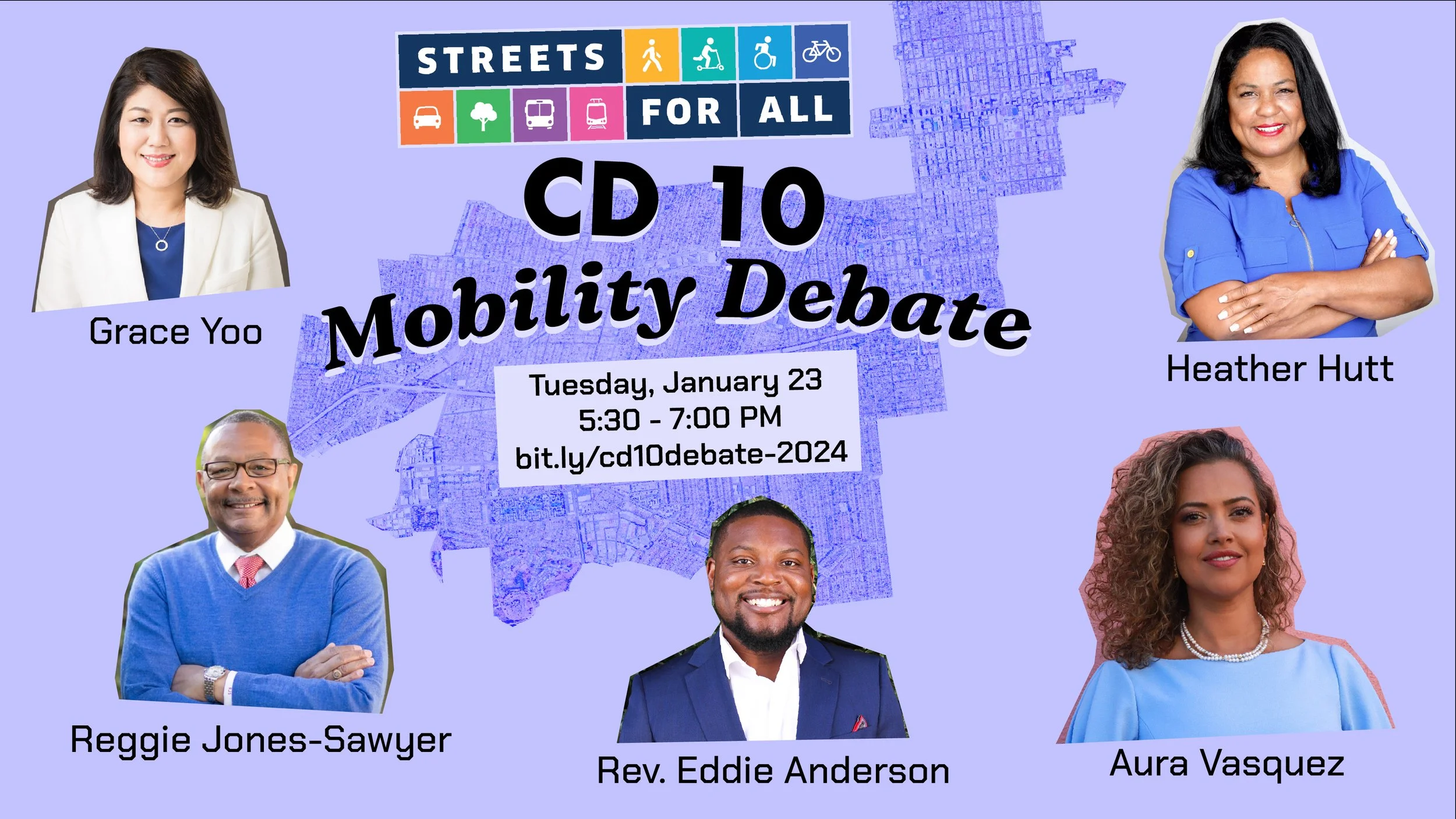 Bring your transportation infrastructure questions for candidates Grace Yoo, Heather Hutt, Reggie Jones-Sawyer, Aura Vasquez, and Eddie Anderson hear their visions for mobility in the area!